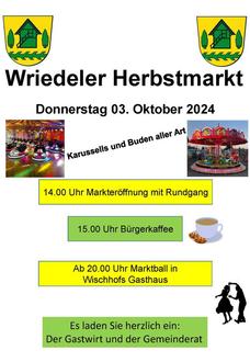 Auch in diesem Jahr wird der Markt am 3.Oktober mit der Markteröffnung um 14.00 Uhr durch den Bürgermeister und dem Gemeinderat eröffnet. Im Anschluss daran findet auf dem Saal des Gasthauses Wischhof gen ca. 15.00 Uhr ein Kaffeetrinken statt. Auf dem traditionellen Marktball gegen ca. 20.00 Uhr im Gasthaus Wischhof kann wieder ausgiebig gefeiert werden. Groß und Klein erkunden den Markt mit Karussells und mehr. „Wir freuen uns auf Sie und hoffen auf gutes Wetter“, lautet die Einladung der Gemeinde Wriedel.
