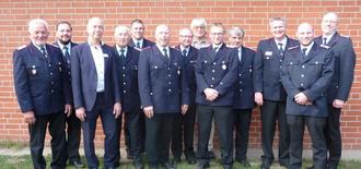 Erinnerungsfoto von der Jubiläumsveranstaltung: von links, Hans-Joachim Bütow, Julian Wulf, Martin Feller, Ehrenbrandmeister Hans-Dieter Bissen, Steffen Becker, Ortsbrandmeister Sascha Gerlach, Dirk Bissen, Jürgen Klippe, Sascha Klinner, Ehrenbrandmeister Carsten Schulze, Gemeindebrandmeister Sven Lühr, Norbert Schulz, Carsten Schroeter.