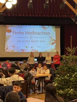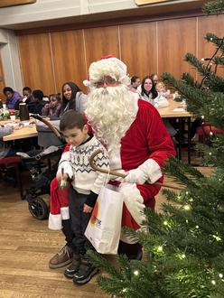 Neben den Geschenken - in diesem Jahr in Form von Gutscheinen -, die die Kinder mit ihren Eltern einlösen können, gab es ein aktives Programm mit viel Musik zu Beginn und am Ende. Gleich zu Beginn forderte die Frauengesangsgruppe mit Mascha Kerstan, Lisa Harms, Alexandra Göing und Sara van der Werf alle Gäste zum Mitsingen mehrerer Weihnachtslieder z.T. in englisch und spanisch auf. Weiter ging es mit dem gemeinsamen Schmücken des mittig plazierten Weihnachtsbaumes, dem Zeichnen von weihnachtlichen Bildern und dem Basteln eines wunderschönen Weihnachtssterns. Ein Highlight war der Kontakt mit dem Weihnachtsmann, der von Tisch zu Tisch ging, die Kinder nach ihren Wünschen befragte und schließlich auch die Geschenke und einen Schokonikolaus an alle verteilte. Viele Kinder wollten unbedingt ein Foto mit dem Weihnachtsmann, was selbstverständlich umgesetzt wurde.