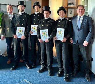 Landrat Axel Flader (rechts) mit den vier neu ernannten Vertretern der Kehrbezirksinhaber