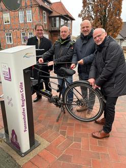 von links: Landrat Axel Flader nahm zusammen mit Jörg Iffländer (stellv. Bürgermeister Gemeinde Wienhausen), Ulrich von dem Bruch (Lüneburger Heide GmbH) und Frank Böse (Samtgemeindebürgermeister Flotwedel) die neue Reparaturstation offiziell in Betrieb.