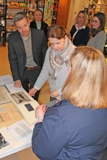 Stadt Bergen - Der Landesbeauftragte für Migration und Teilhabe, Deniz Kurku und Bürgermeisterin Claudia Dettmar-Müller lassen sich von Stadtarchivarin Britta Hemme Exponate aus der Heimatsammlung Altburgund-Schubin erklären.