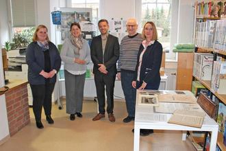 Stadt Bergen - v.l.n.r. Britta Hemme (Leiterin des Stadtarchivs Bergen), Bürgermeisterin Claudia Dettmar-Müller, der Landesbeauftragter für Migration und Teilhabe Deniz Kurku, Peter-Andreas Moneke (ehrenamtlicher Mitarbeiter im Stadtarchiv Bergen, Anja Schulz (Mitarbeiterin Stadtbücherei Bergen).