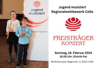 Einen 1. Preis mit Weiterleitung zum Landeswettbewerb erhielten an der Blockflöte Karoline Doormann (Altersgruppe II, 23 Punkte) und Helene Doormann (AG III, 24 Punkte), an der Klarinette Margarethe Luise Stumpf (AG IV, 25 Punkte) und Matthis Wolter (AG IV, 24 Punkte), an der Oboe Jan Willamowski (AG IV, 25 Punkte) sowie an der Trompete Moritz Bühring (AG IV, 25 Punkte). Die beeindruckenden Leistungen des Blockflötisten Johann Doormann an der Blockflöte (AG Ib, 25 Punkte) und der Querflötistin Laura Volkert ( AG Ib, 24 Punkte) führten ebenfalls jeweils zu einem 1. Preis, eine Weiterleitung zum Landeswettbewerb ist jedoch erst ab Altersgruppe II möglich. Elina Pavlov (AG II, 21 Punkte) und Moira Baltzer (AG III, 22 Punkte) an der Querflöte erhielten 1. Preise ohne Weiterleitungen zum Landeswettbewerb. Ein 2. Preis ging an Lea Hollung (Querflöte) in Altergruppe IV mit 20 Punkten.