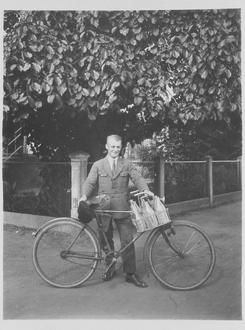 Milchmann bei der Lieferung mit dem Fahrrad.