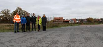 Bürgermeisterin Claudia Dettmar-Müller, Ortsbürgermeister Björn Frieling, Frank Juchert und Simone Paton (SEB), Karlheinz Krüger (Stadt Bergen) sowie ein Vertreter der ausführenden Firma Lohmann im neu erschlossenen Baugebiet Moorkamp.