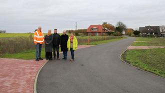 (Bürgermeisterin Claudia Dettmar-Müller, Ortsbürgermeister Michael Buhr, Frank Juchert und Simone Paton (SEB) sowie Karlheinz Krüger (Stadt Bergen) in dem neuen Baugebiet Sülze Waldhof
