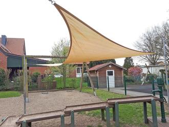 Auch die Kita Eversen war dabei. "Das ganze Projekt startete mit einer digitalen Projekteinführung mit Präventionsfachleuten der IKK classic", erinnert sich die Kita-Leiterin Petra Ahrens-Matzen. "Gemeinsam haben wir das Projekt besprochen und in unserer Kita Sonnenschutzmaßnahmen geplant und deren Umsetzung in einer Sonnenschutzvereinbarung festgehalten." Ausgewählte ErzieherInnen der Einrichtung wurden als sogenannte Sonnenschutzbeauftragte durch die Hautärztin Dr. med. Maren Stahl aus Osterode am Harz im richtigen Umgang mit der Sonne geschult. Die Eltern der Kita-Kinder erhielten bei einem Online-Elternabend zudem von Frau Dr. Stahl wichtige Informationen und Antworten auf alle ihre Fragen zum Sonnenschutz im Kindesalter. Zusätzlich statteten die Niedersächsische Krebsgesellschaft und die IKK classic die Kita mit einer Sonnenschutzbox mit Projektmaterialien und Sonnenschutzmützen mit Nackenschutz aus. Für mehr Schattenflächen zum Spielen im Außenbereich sorgte die Kita selbst: Über der Sandkiste schwebt ein großes Sonnensegel.