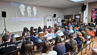 Politische Europabildung hoher Qualität ist der Anspruch der Europa-Union Deutschland - EUD Kreisverband Göttingen e.V., wenn sie den Mainzer Politologen Ingo Espenschied an unserer Carl-Friedrich-Gauß-Oberschule in Groß Schneen die Geschichte der Europäischen Integration unter dem Motto „75 Jahre Europa“ in Erinnerung an den 75. Jahrestag des Schuman-Plans vorstellen und mit den Schülerinnen und Schülern interaktiv besprechen lassen.