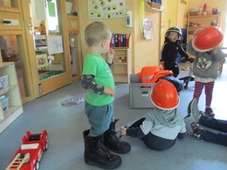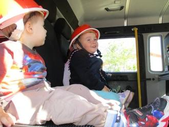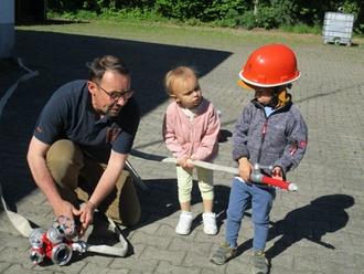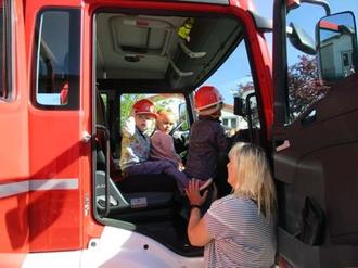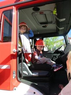 Ein weiteres Highlight stellte der Besuch der örtlichen Feuerwehr dar. Zwei freiwillige Feuerwehrmänner nahmen sich viel Zeit, um den Kindern die Ausrüstung, das Feuerwehrauto und ihre Aufgaben näherzubringen. Die Kinder durften Fragen stellen, Helme aufsetzen, mit Taschenlampen experimentieren und sogar im Feuerwehrauto Platz nehmen – ein Erlebnis, das bei allen für strahlende Gesichter sorgte. Selbst einige der Kleinsten aus der Krippe waren begeistert mit dabei.