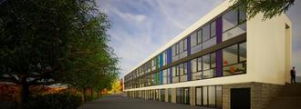 Hier sehen Sie die Mensa der Schule. Hier essen die Kinder Mittag und der Raum kann auch für den Ganztag genutzt werden. Er hat Bodentiefe große Fenster, so dass viel Tageslicht hineingelangt. Von dort aus können die Kinder direkt auf die große Terrasse wo sie Tischtennis spielen können oder auch an den Tischbänken verweilen können.