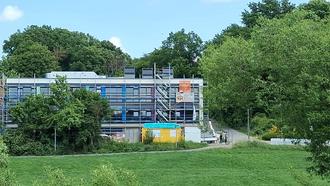 Ansicht Anfang Juni, das Gerüst wird zeitnah abgebaut. In das Gebäude werden nach dem Sommerferien 7 Klassen einziehen.