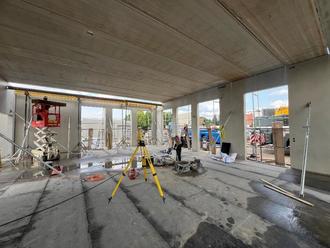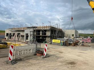 Der vordere Bereich, wo sich die Parkplätze befinden und die Busse durchfahren, wird derzeit gepflastert. Ende Juni ist das Richtfest und dann beginnt der Innenausbau.