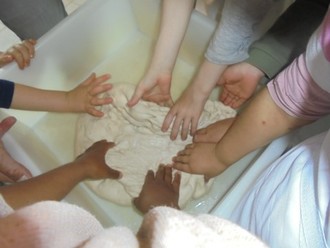Die Kinder lernten spielerisch die drei Grundzutaten des Brotbackens kennen und durften dabei große Schüsseln, kräftige Rührgeräte und riesige „Teigzerkleinerer“ bestaunen, die die Kinder an zusammengesetzte Pizzaschneider erinnerten.