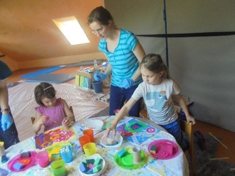 Mit Pinseln, Schwämmen, Toilettenrollen und Wattestäbchen wurden fantasievolle Bilder gestaltet, die im Anschluss zu einer großen Collage zusammengefügt und beim Fest präsentiert wurden. Ein herzliches Dankeschön geht an Frau Robisch für die kreative Vorbereitung sowie an Frau Robisch und Frau Pelka für die liebevolle Durchführung dieses besonderen Tages. Die Begeisterung der Kinder über ihre eigenen Werke war groß – viele konnten den Blick kaum von ihren Bildern abwenden.