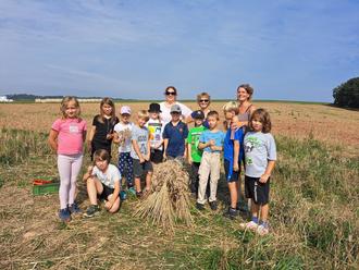 Wir durften verschiedene Getreidesorten finden, wie Triticale, Weizen und Roggen. Zum Schluss durften wir erraten, wie viele Ähren in einer Garbe sind. Insgesamt waren es 400 pro Garbe.