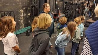 Im Rahmen eines Projekttages wurden den Kindern der Klasse 3 und uns Begleiterinnen die Türen noch weiter geöffnet und wir konnten einen Blick hinter die Kulissen werfen. Ganz spannend waren nicht nur der Anblick von der Bühne hinein in den Publikumsbereich, sondern auch die Entdeckung, wie viel Technik und Personal im Hintergrund notwendig ist. All die Hebel, Leuchten, Züge und aufwändigen Kulissen, die ja irgendwo Platz finden und blitzschnell umgebaut werden müssen, waren sehr beeindruckend! Hinter dem Vorhang gibt es sogar einen besonderen Platz für die Feuerwehr, der während der Aufführungen immer besetzt ist! So viele verschiedene Menschen waren in Vorbereitung für die Abendvorstellung emsig beschäftigt! Wir durften sogar in die verschiedenen Werkstätten hineingehen und usn gründlich umsehen. Dort fanden wir viele spannende Dinge heraus über Berufsfelder rund um die Bühne, insbesondere auch kreative, technische und handwerkliche Beruf (Beleuchter*in, Maskenbildner*in, Schneider*in, Bühnenbauer*in…). Alle Theaterleute hießen uns freundlich willkommen und beantworteten bereitwillig unsere vielen Fragen.