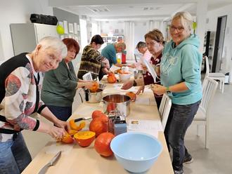 Gemeinsam wurden zwei verschiedene Kürbissuppen zubereitet: Die klassische Variante mit Kürbis, Kartoffeln, Möhren, Zwiebeln, Butter, Sahne und weiteren Zutaten sowie eine Alternative mit Kürbis, Kokosmilch, Ingwer, Orangensaft und Gewürzen. Beide Suppen fanden ihre begeisterten Anhänger, und die Kombination beider Sorten war ebenso ein Genuss. Neben traditionellem Baguette gab es dazu auch ein besonders leuchtendes Kürbisbrot, das nicht nur optisch ein Highlight war, sondern auch geschmacklich überzeugte.