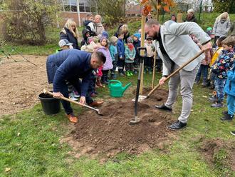 Frisch versenkt in Osloßer Erde: Ein Spitzahorn auf dem Gelände des Kindergartens Osloß.