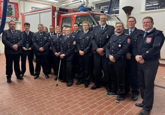 Geehrte, Bestellte und Beförderte nach der Jahreshauptversammlung. Ganz rechts der Gemeindebrandmeister, 6. von links die Ortsbrandmeisterin