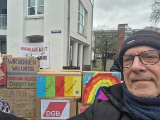 Viele Demo-Teilnehmer, wie der Osloßer Ratsherr Michael Schhighqe, hatten bunt bemalte und beklebte Umzugskartons mitgebracht, die symbolisch zur „Brandmauer gegen Rechts“ aufgestapelt wurden