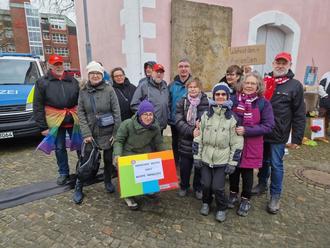 Seitlich vor dem Rathaus sowie entlang der Kirchenmauer war aus hunderten von bunten Pappkartons eben jene Brandmauer aufgestapelt worden, die das Motto der Veranstaltung widerspiegelte. Ein NDR-Fernsehteam filmte und am Abend war Gifhorn in „Hallo Niedersachsen“ zu sehen.