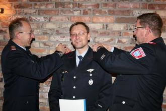 Stellvertretender Ortsbrandmeister Arne Dürheide wurde von Kai Plankemann (links) und Matthias Meier zum Oberlöschmeister befördert