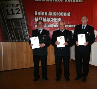 Seltene Ehrung: (von links) Joachim Dürheide, Heinrich Michel und Peter Jahn sind 60 Jahre Mitglieder der Feuerwehr