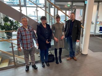 Gaben sich ebenfalls die Ehre: Gleichstellungsbeauftragte Astrid Wonde (2.v.lks.) und Samtgemeindebürgermeister Dennis Ehrhoff (re.) mit Alfred Senft und Künstlerin Jenny Kracht