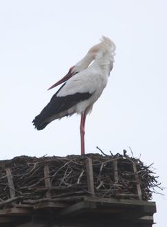 Der Jembker Storch rekelt und streckt sich im neuen, gekürzten Nest