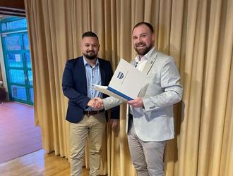 Samtgemeindebürgermeister Patrick Rymas (rechts) übergibt Arthur Matis seine Ernennungsurkunde