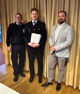 Gemeindebrandmeister Matthias Meier (links) und Bürgermeister Rymas gratulieren René Bamberger
