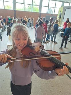 Zunächst wurden den Schülerinnen und Schülern die vier Instrumentengruppen des Orchesters vorgestellt. Im Rahmen einer Instrumentenschau durften die Kinder die Instrumente Trommel, Kontrabass und Geige auch alle ausprobieren. Dieses Angebot nahmen sie mit großer Begeisterung an.