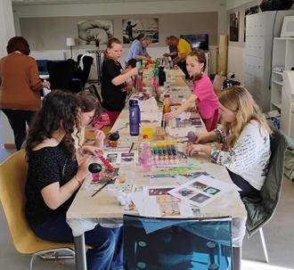 Staunend steht Jenni Drees neben den Kindern und bewundert die Ergebnisse