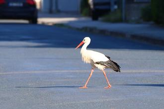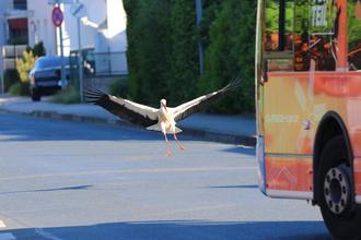 Storchenvater Woody fliegt todesmutig auf einen einfahrenden Bus zu....