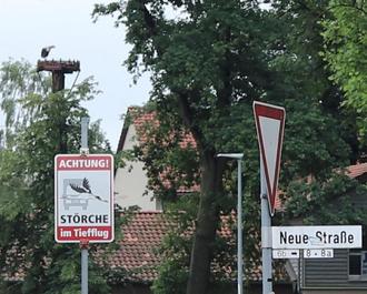 Die Samtgemeindeverwaltung hat nach dieser Information sofort reagiert und Warnschilder aufgestellt, um bis August motorisierte Verkehrsteilnehmer vor den „tieffliegenden Störchen“ in Weyhausen zu warnen. Demnächst soll auch noch ein zeitlich befristet aufgehängtes Warn-Banner über der Straße hinzukommen, denn innerhalb von ca. zehn Wochen werden die kleinen Störche flügge. Hoffentlich machen sie Woody dann den Unsinn nicht nach, und landen bei ihren ersten Flugversuchen auch auf der Straße!