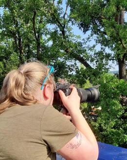 Storchenbetreuerin Rita Lunde steigt der OBS aufs Dach und beobachtet von dort aus die Störche mit dem 600 Millimeter Teleobjektiv