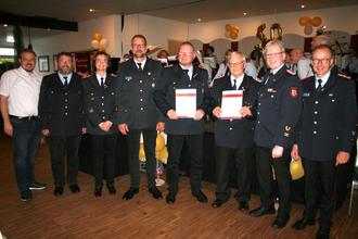 Ehrung der Gründungsmitglieder: (v. li.) Samtgemeindebürgermeister Dennis Ehrhoff, Musikzugführer André Ladendorf, Dirigentin Silke Neumann, Kreisstabführer Bernd Wilmer, Gründungsmitglied Jürgen Schlüter, Gründungsmitglied Heinrich Michel, Brandabschnittsleiter Nord Olaf Müller, Ortsbrandmeister Kai Plankemann
