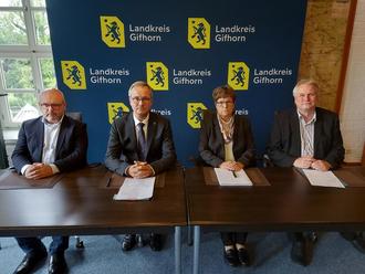 Der designierte Kreiswahlleiter Björn Sund (von links), Erster Kreisrat Dominik Meyer zu Schlochtern, Kreisrätin Ute Spieler und Kreisrat Rolf Amelsberg informierten während einer Pressekonferenz am 5. Juni nach dem unvorhergesehenen und plötzlichen Tod von Landrat Tobias Heilmann über die Trauerfeier und die bevorstehende Wahl
