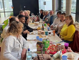 Der Übergang vom A2- zum B1-Kursus (Sprachniveau für die Berufstätigkeit) ist eine große Hürde für die Ukrainer*innen: „Einige Teilnehmende haben ihre Prüfung nicht bestanden, aber bei uns werden sie noch einmal darauf vorbereitet“, sagt Olfa Zaibi, LEB-Koordinatorin für die Landkreise Gifhorn, Peine und Helmstedt. Ihr Mann Chokri Zaibi ist Migrantenvertreter der IG Metall, und auch die unterstützte die zweite Ukrainer-Party in Weyhausen.