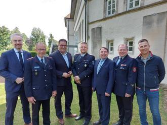 Von links: Erster Kreisrat Dr. Thomas Walter, Kai Plankemann, Landrat Tobias Heilmann, neuer Amtsinhaber Christoph Labion, Matthias Rüger (Abteilungsleiter Brand- und Katastrophenschutz), Kreisbrandmeister Jens Dieckmann und Andreas Fricke, Fachbereichsleiter
