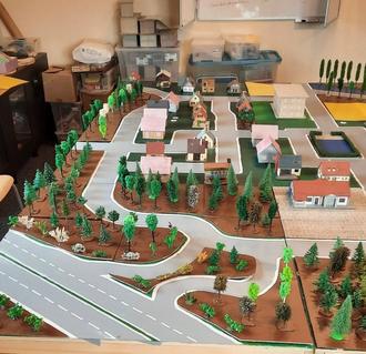 Nach etwa zehn Entwurfszeichnungen ging es schließlich an die Gestaltung der Einzelplatten. Im vergangenen November konnten dann die ersten Stellproben der Bäume und Sträucher sowie der Gebäude erfolgen. Hier geht unser besonderer Dank an die Spender der Utensilien. Modellbaufans haben uns sehr geholfen, indem sie uns Miniaturen zur Verfügung stellten. Auf die Weise konnten einige hundert Euro gespart werden. Durch Atze wurden die Sachen gesichtet, sortiert und gegebenenfalls repariert. Im April 2024 waren die Arbeiten abgeschlossen und die Planspielplatten konnten dem Gemeindekommando im Juni vorgestellt werden.