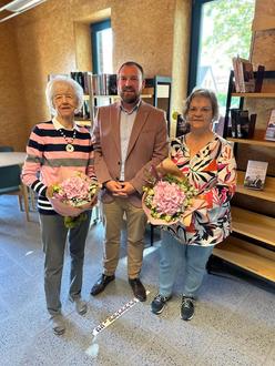 Nach 46 „Dienstjahren“ im Ehrenamt übergab die 79-jährige Christel Röpke jetzt auch offiziell die Leitung der Samtgemeindebücherei an ihre langjährige Mitarbeiterin Marion Kagelmann. Eigentlich schon zum ersten Januar hatten Damen die Rollen getauscht: die 61-jährige Kagelmann wurde von der „Stellvertreterin der stellvertretenden Büchereileiterin“ (ist und bleibt Anne Brandstätter) zur Chefin, während Röpke ihren Posten übernahm. „Ich bin noch im Team“, sagt Christel Röpke. Dies besteht aktuell aus neun Frauen und einem Schüler, der zu den Zeiten der Schüler-Buchausleihe mithilft. Samtgemeindebürgermeister Patrick Rymas bedankte sich bei der ehemaligen Leiterin für ihr langjähriges Engagement und ihren Einsatz für die Bücherei mit einem Blumenstrauß. „Es ist nicht selbstverständlich, dass jemand diese Tätigkeit mit so viel Herzblut und über einen so langen Zeitraum ausübt. Hierfür möchte ich einfach Danke sagen“, so Rymas. Frau Kagelmann wünschte er für die Tätigkeit „alles Gute und viel Erfolg bei der Umstellung auf digitale Prozesse sowie eine hoffentlich ebenfalls lange Zusammenarbeit“. Denn in der Bücherei soll es demnächst auch Diensthandys geben, für eine Social-Media-Präsenz, nachdem vor einigen Jahren schon der Bestand digitalisiert worden war. Das Gebäude der Bücherei Ecke Neue Straße/Kirchweg wird übrigens im August 25 Jahre alt! Zum Geburtstag wünscht sich das Büchereiteam vor allem eins: Neue Hinweisschilder! „Eins in der Neuen Straße und eins an der Tür, damit wird besser gesehen werden“, sagt Christel Röpke. Der Samtgemeindebürgermeister versprach, diesen Wunsch zu erfüllen.