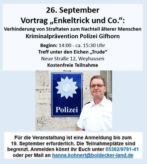 Damit Sie gut vorbereitet sind, um auf solche perfiden Tricks nicht hereinzufallen, möchte Sie Herr Kriminalhauptkommissar Klaus Ahne vom Präventionsteam der Polizeiinspektion Gifhorn in einem Vortrag über alte und neue Tricks von verschiedenen Tätergruppierungen informieren: Lernen Sie Situationen richtig einzuschätzen und wehren Sie sich gegen Trickdiebe, die versuchen in Ihre Wohnung zu gelangen. Entlarven Sie falsche Verwandte und erkennen Sie betrügerische Gewinnversprechen.