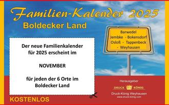 Wann genau und wo der Familienkalender 2025 im November kostenlos für die Familien im Boldecker Land erhältlich ist, erfahren Sie in einer der nächsten Ausgaben im Mitteilungsblatt.