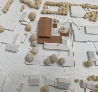 Der Erweiterungsbau, dargestellt als braunfarbiger Gebäudeteil, im Modell