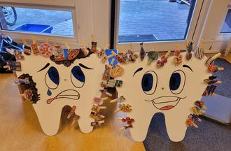 In einem gemeinsamen Spiel lernten wir, was für unsere Zähne gesund und ungesund ist. Wir lernten auch, dass man nur eine Handvoll Süßigkeiten am Tag essen sollte.