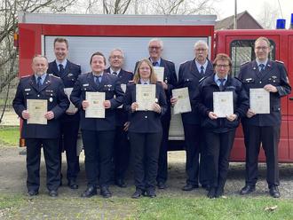 Neun aktive FeuerwehrkameradInnen nahmen am 2. März 2024 im Rahmen einer außerordentlichen Aktivenversammlung die neue Auszeichnung für langjährige aktive Mitgliedschaft oder Arbeit im Ortskommando in Empfang – die Bandschnalle der Freiwilligen Feuerwehr Croya. Stellv. Ortsbrandmeister Pascal Jahnkow erläuterte die Kriterien für die Auszeichnung und verlieh für langjährige aktive Mitgliedschaft die Bandschnalle in Bronze an Pierre Jahnkow sowie die Bandschalle in Silber an Manuela Peckmann und Thorsten Schütte. Die Ehrenstufe der Bandschnalle für langjährige, hingebungsvolle Mitarbeit im Ortskommando verlieh er Thomas Richter, Heinz Jahnkow, Cornelia Jahnkow, Pascal Jahnkow, Günter Jahnkow und Torsten Hadwiger. Weitere zu Ehrende waren nicht anwesend und bekommen Urkunde und Bandschnalle zu einem späteren Zeitpunkt überreicht. Die Bandschnalle ist Zeichen der Wertschätzung und Dankbarkeit für den langjährigen aktiven Einsatz in unserer Feuerwehr sowie außergewöhnlicher Einsatzbereitschaft und unermüdlichen Engagements. Im Anschluss gab es ein gemütliches Beisammensein mit einem Imbiss und so manchen Anekdoten aus den vergangengen Jahren.