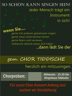 Chorproben finden wöchentlich mittwochs von 19.30 Uhr bis 21 Uhr statt, 19 Uhr wäre auch möglich.