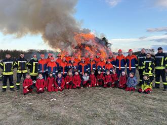 Am großen Osterfeuerhaufen angekommen, verteilte sich der Feuerwehrnachwuchs um den Haufen und zündete nach dem Kommando der Betreuer diesen an. Im Anschluss wurde ein gemeinsames Gruppenfoto gemacht und ein gemeinsames Getränk zu sich genommen.